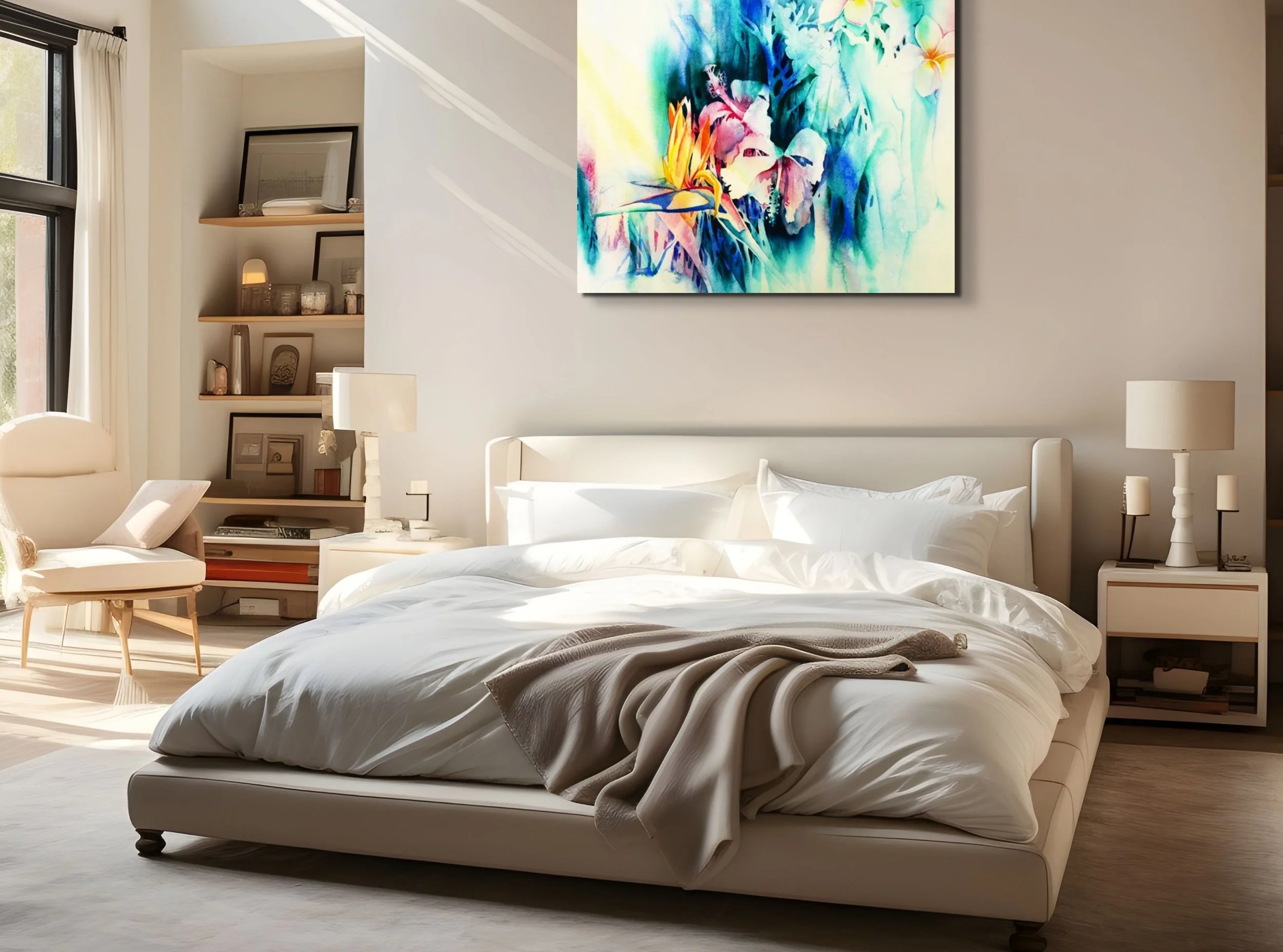 Soft hibiscus blooms drift through blues, violets, and greens, creating a serene sense of renewal and calm. Flourish invites viewers everywhere to pause, breathe, and let beauty unfold in their own space. A gentle daily reminder to grow, soften, and thrive—wherever it hangs.